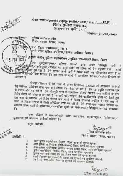 सभी को अवगत कराना है कि विशेष शाखा के द्वारा एक पत्र प्राप्त हुआ है जिसमें इस बात का उल्लेख किया गया है कि हाल में कुछ भोजपुरी गाने अश्लील प्रकृति के हैं और इसमें कुछ गानों में जातिसूचक शब्दों का वर्णन है जिसके वजह से कई बार इन गानों के किसी विशेष आयोजन के समय बजाए जाने के उपरांत स्थानीय लोगों में आपस में तनाव उत्पन्न होता है अतः सभी जिला पदाधिकारी और पुलिस अधीक्षक को यह निर्देशित किया गया है कि सभी अवर पदाधिकारियों के माध्यम से ऐसे गानों पर सख्ती बरतनी है और ऐसे अश्लील गानों को बजाने वालों और सोशल मीडिया पर अपलोड करने वालों या ऐसे गानों के माध्यम से सामाजिक तनाव उत्पन्न करने वाले असामाजिक तत्वों के खिलाफ विधि संगत कार्रवाई करने का निर्देश प्राप्त है इस आलोक में सभी अनुमंडल पुलिस पदाधिकारी और थानाध्यक्ष तथा अन्य पदाधिकारियों को विधि सम्मत कार्यवाही हेतु निर्देशित कर दिया गया है और मीडिया के माध्यम से भी अनुरोध है कि आमजन ऐसे अश्लील और विवाद उत्पन्न करने वाले गानों को बजाने से और किसी भी सोशल मीडिया पर अपलोड करने से बचें.