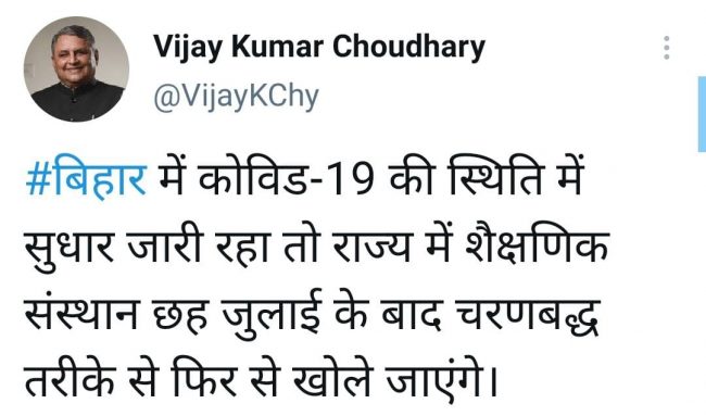 बिहार में अब कोरोना संक्रमण नियंत्रण में दिख रहा है. इसे देखते हुए बिहार के शिक्षा मंत्री ने ट्वीट करके इस बात की जानकारी दी है कि अगर कोविड-19 की स्थिति में सुधार जारी रहा तो 6 जुलाई के बाद चरणबद्ध तरीके से शिक्षण संस्थानों को खोला जाएगा. दरअसल इस वर्ष अप्रैल से कॉलेज और स्कूल बंद होने की वजह से नए शैक्षणिक सत्र में एडमिशन की प्रक्रिया भी शुरू नहीं हो पाई.