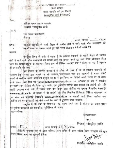 कोरोना संकट के बीच बिहार के कला, संस्कृति एवं युवा विभाग ने ग्रामीण कलाकारों की मदद की पहल की है. कला संस्कृति एवं युवा विभाग बिहार सरकार के मंत्री प्रमोद कुमार ने बताया कि यह बिहार के उन कलाकारों के लिए है जो ग्रामीण क्षेत्रों में निवास करते हैं और अपनी आजीविका हेतु पूर्ण रूप से कला लोक कला के प्रदर्शन पर निर्भर हैं.