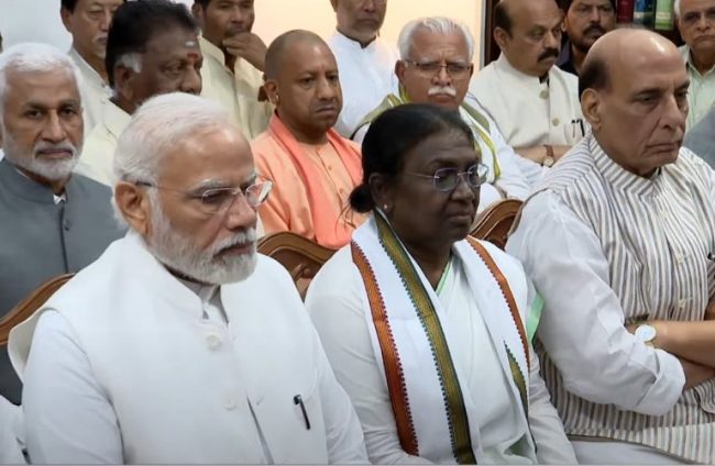 एनडीए की राष्ट्रपति पद की उम्मीदवार द्रौपदी मुर्मू ने आज प्रधानमंत्री नरेंद्र मोदी, केंद्रीय कैबिनेट मंत्रियों और भाजपा एवं एनडीए शासित राज्यों के मुख्यमंत्रियों की उपस्थिति में अपना नामांकन दाखिल किया.प्रधानमंत्री नरेंद्र मोदी उनके प्रस्तावक बने.