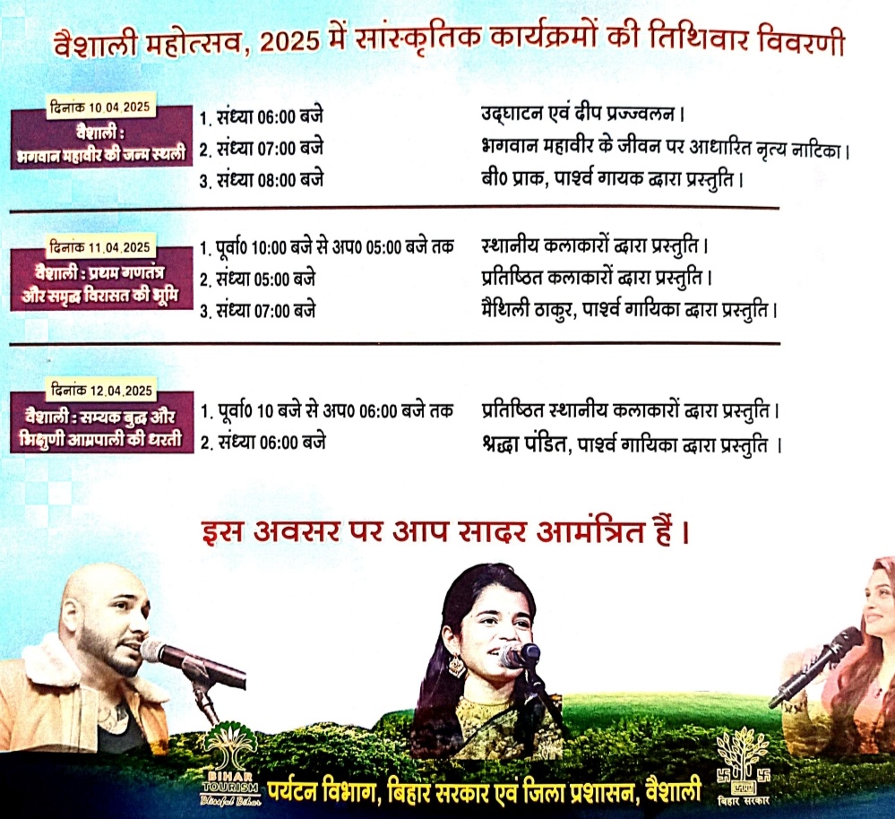 पहले दिन संध्या में सात बजे भगवान महावीर के जीवन पर आधारित नृत्य नाटिका दिखाई जाएगी और इसके उपरांत प्रसिद्ध बॉलीवुड पार्श्वगायक बी प्राक अपनी प्रस्तुति देंगे. दूसरे दिन स्थानीय कलाकारों के द्वारा प्रस्तुति दी जाएगी और इसके उपरांत प्रसिद्ध पार्श्वगायिका मैथिली ठाकुर का गायन होगा और तीसरे दिन पार्श्वगायिका श्रद्धा पंडित की संगीतमय प्रस्तुति होगी. निदेशक ने स्थानीय लोगों से अपील की है कि वे वैशाली महोत्सव में अवश्य भाग लें और अपने समृद्ध विरासत से परिचित हों.