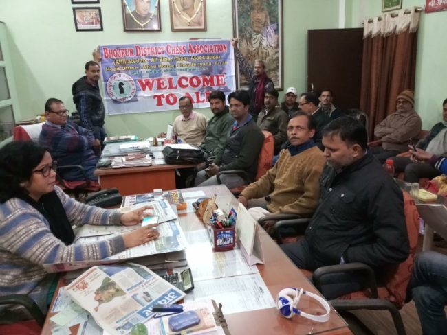 आरा, 21 दिसम्बर. जिला स्तरीय शतरंज प्रतियोगिता का आयोजन आगामी 26-29 दिसम्बर तक स्थानीय सम्भावना आवासीय स्कूल में होगा. इस आयोजन के आयोजन समिति के गठन को लेकर आज एक बैठक विद्यालय प्रांगण में हुई, जिसमे भोजपुर जिला शतरंज संघ के सचिव प्रो० मोo सैफ ने कहा कि इस वर्ष का आयोजन सम्भावना आवासीय उच्च विद्यालय के संस्थापक स्व. शारदा प्रसाद सिंह की स्मृति में होगा. 4 दिवसीय इस आयोजन में सर्वसम्मति से सम्भावना स्कूल की प्राचार्या डॉ अर्चना सिंह को आयोजन समिति का अध्यक्ष सर्वसम्मति से मनोनित किया गया. भोजपुर जिला शतरंज प्रतियोगिता 2017-18 के इस चार दिवसीय आयोजन में जिले भर कई स्कूलों और कॉलेजों से अंडर-7, अंडर-11, अंडर-15 और सीनियर वर्ग में महिला और पुरुष वर्ग से लगभग 300 प्रतिभागी भाग लेंगे. बैठक में सभी सदस्यों को आयोजन से सम्बन्धित विभिन्न कार्य सौंपे गए.भोजपुर जिला शतरंज संघ के कार्यकारी अध्यक्ष द्विजेन्द्र किरण ने बताया कि आयोजन की भव्य तैयारियां लगभग पूरी कर ली गई है.
