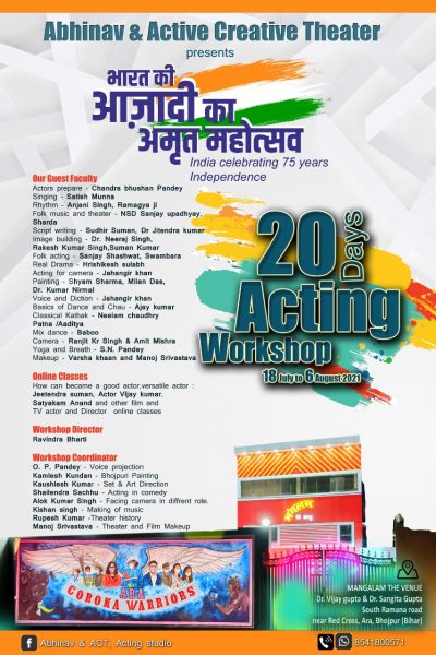 आरा, 16 जुलाई. भोजपुर जिले की थियेटर में अग्रणी रँग संस्था अभिनव और ऐक्ट आरा आगामी 18 जुलाई से 6 अगस्त तक एक नाट्य कार्यशाला का आयोजन करने जा रही है. संस्था 20 दिनों तक चलने वाले इस कार्यशाला में 6 साल से 14 साल और 15साल और उससे अधिक दो श्रेणियों के लोगों के लिए नाट्य कार्यशाला का आयोजन करने जा रही है. इस कार्यशाला में देश के नामी कई थियेटर दिग्गजो के शरीक होने की खबर है. थियेटर के दिग्गजों के साथ पेंटिंग, क्राफ्ट,मेकअप,संगीत,नृत्य और कैमरा फेसिंग के भी कई दिग्गज कार्यशाला में आने वाले थियेटर प्रेमियों को अपने हुनर को उनमें भरेंगे. बाहर के वैसे लोग जो फ़िल्म इंडस्ट्री से जुड़े हैं वे भी इन बच्चों को ऑनलाइन के जरिये अपना हुनर इनमें भरेंगे. पहले दिन प्रशिक्षण में बतौर प्रशिक्षक जहांगीर खान आएंगे और थियेटर की बारीकियों को बताएंगे.