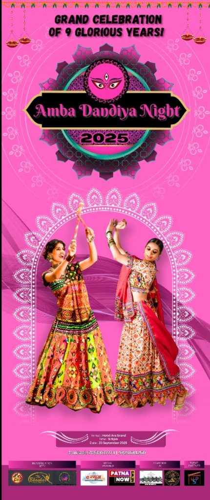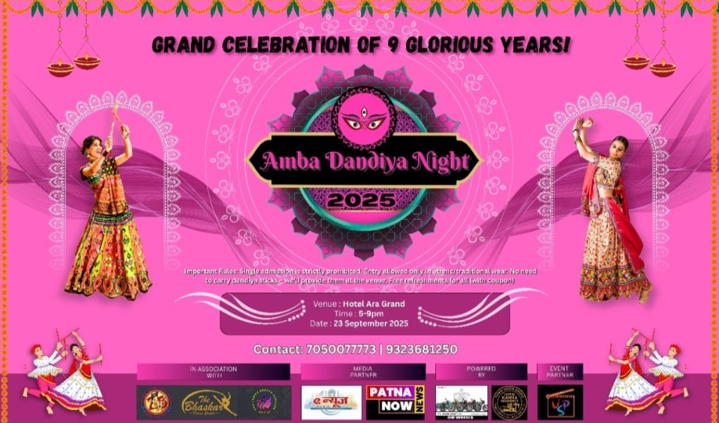 अम्बा संस्था द्वारा आयोजित डांडिया नाइट 2025 का भव्य आयोजन आज मंगलवार यानि 23 सितंबर, मंगलवार को होटल आरा ग्रांड में होगा। लगातार नौवें वर्ष आयोजित होने जा रहे इस कार्यक्रम को लेकर तैयारियां पूरी हो चुकी हैं। आयोजन को इस बार खास बनाने के लिए “मंगल” और “नौ” का अद्भुत संयोग बना है।