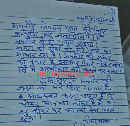 चोकर बाबा ने अमनौर की जनता को एक भावनात्मक पत्र के माध्यम से अपील की है कि मैं चोकर बाबा अमनौर का नौकर हूं. अमनौर की जनता उन्हें एक बार फिर इस क्षेत्र के विकास के लिए वोट देना चाह रही है चोकर बाबा का भावनात्मक पत्र नीचे दिया गया है.