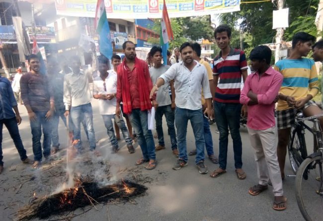 वीर कुँवर सिंह विश्वविद्यालय की आयोजित हुई बीएड संयुक्त प्रवेश परीक्षा का उत्तर लीक होने के बाद एनएसयूआई भोजपुर जिला इकाई के महासचिव नितेश सिंह तथा सुमित ठाकुर के नेतृत्व में प्रश्न पत्र लीक हुए मामले में करवाई को लेकर कुलपति का पुतला दहन आरा के जज कोठी मोड़ पर किया गया.
