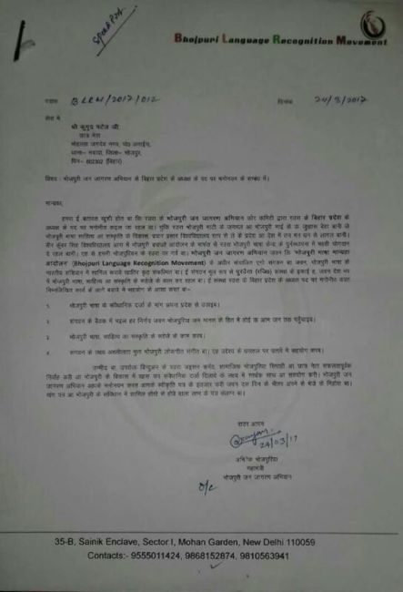- भोजपुरी भाषा को 8 वीं अनुसूची में शामिल कराना