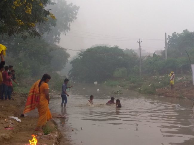 नहर किनारे कूड़े कचरों के जले अवशेषों के बीच ही आस्था भारी दिखी. छठ व्रतियों ने इसी गंदे पानी मे ही मजबूरी में व्रत किया.