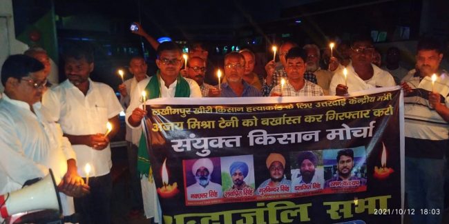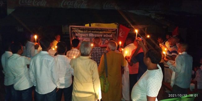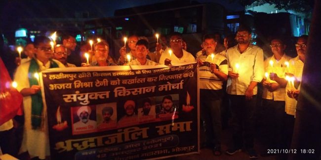 आरा, 13 अक्टूबर 2021. अखिल भारतीय किसान महासभा भोजपुर ने आरा के बस पड़ाव में लखीमपुर खीरी किसान हत्याकांड में शहीद हुए किसानों को मोमबत्ती जला कर श्रद्धाजंलि दी और एक छोटी सभा की. श्रद्धाजंलि सभा में लखीमपुर खीरी किसान हत्याकांड के लिए उत्तरदाई केन्द्रीय मंत्री अजय मिश्रा टेनी को बर्खास्त कर गिरफ्तार करने की मांग एकस्वर से लोगों ने की. इस श्रद्धाजंलि सभा में अखिल भारतीय किसान महासभा के महासचिव कार्यकारणी सदस्य व माले केंद्रीय कमिटी सदस्य राजू यादव,राज्य कमिटी सदस्य क्यामुदिन अंसारी, आइसा राज्य सचिव सबीर कुमार, जसम के राज्य सचिव सुधीर सुमन,वरिष्ठ साहित्यकार व प्रोफेसर बलभद्र ,साहित्यकार सुमन सिंह,इनौस जिला संयोजक शिवप्रकाश रंजन,आइसा जिला सचिव विकास कुमार,माले नेता बालमुकुन्द चौधरी,सत्यदेव कुमार,अमित कुमार बंटी,राजेन्द्र यादव,कृष्ण रंजन गुप्ता,अजय गांधी,मीडिया प्रभारी चन्दन कुमार, रौशन कुशवाहा,प्रमोद रजक, निरंजन केशर, अभय सिंह, बबलू गुप्ता,लक्ष्मी पासवान सभा का संचालन माले नगर सचिव दिलराज प्रीतम ने किया.