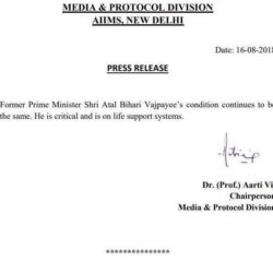 नयी दिल्ली (ब्यूरो रिपोर्ट) | देश के पूर्व प्रधानमंत्री अटल बिहारी वाजपेयी की स्थिति में कोई सुधर नहीं हुआ है. आज दोपहर एम्स की तरफ से जारी लिखित बयान में फिर से उनकी हालत नाजुक होने की सुचना है. ज्ञातव्य है 93 साल के अटल बिहारी वाजपेयी कई बीमारियों से जूझ रहे हैं. उन्हें