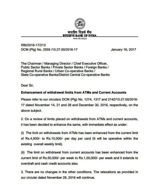 नोट बंदी के बाद लोगों को अब कुछ राहत मिलेगी क्योंकि रिजर्व बैंक (आरबीआई) ने सोमवार को एटीएम से रोजाना निकासी की सीमा को 4,500 रुपये से बढ़ाकर 10,000 रुपये कर दिया है, साथ ही चालू खाता से निकासी की साप्ताहिक सीमा को 50,000 रुपये से बढ़ाकर 1 लाख रुपये कर दी है. आरबीआई ने कहा है कि बचत खाते से धन निकालने की साप्ताहिक सीमा 24,000 रुपये में कोई बदलाव नहीं किया गया है. इस सीमा के अंतर्गत ही एटीएम से 10,000 रुपये रोजाना की सीमा में नकदी निकाली जा सकती है.आरबीआई ने कहा, “एटीएम और चालू खाता से निकासी की संशोधित सीमा तुरंत प्रभाव से लागू की जाती है.