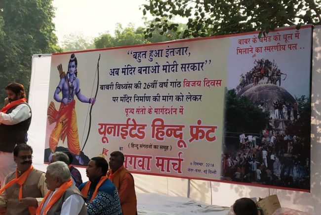 जिसकी जिम्मेदारी सर्वप्रथम जय भगवान गोयल ने ली थी. बृहस्पतिवार को 6 दिसंबर 2018 को जय भगवान गोयल ने मोदी सरकार से आग्रह किया कि अयोध्या में राम मंदिर बनाओ नहीं तो जिस तरह मस्जिद गिराया था, उसी तरह मंदिर भी बनाएंगे. उन्होंने कहा, अयोध्या आंदोलन ने बीजेपी के कई नेताओं को देश की राजनीति में एक पहचान दी, लेकिन राम मंदिर के लिए सबसे बड़ी कुर्बानी पार्टी नेता कल्याण सिंह ने दी. वे बीजेपी के इकलौते नेता थे, जिन्होंने 6 दिसंबर 1992 में अयोध्या में बाबरी विध्वंस के बाद अपनी सत्ता को बलि चढ़ा दिया था. राम मंदिर के लिए सत्ता ही