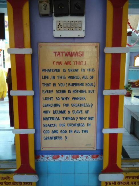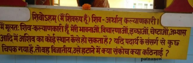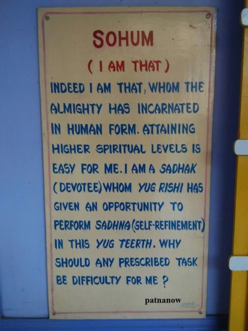 तभी हमें इन आइनो के पास लिखे हुए कुछ संस्कृत, हिंदी और अंग्रेजी के शब्द मिले. लेकिन इससे पहले कबीर दास की याद ने ये एहसास दिला दिया था कि ये भटका हुआ देवता कोई और नहीं बल्कि हम इंसान ही हैं. इन आदमकद आइनो के ऊपर लिखा हुआ है – सोsहम, शिवोsहम, सच्चिदानंदोह्म, अयात्मा ब्रह्म, तत्त्वमसि. इन शब्दों का अर्थ भी पास लगे बोर्ड पर लिखा हुआ है. जब इन आइनो को देखने पर खुद का चेहरा दिखता है तब पता चलता है कि ये खोया हुआ देवता कोई और नहीं बल्कि हम इंसान ही है. अब सवाल ये उठता है कि इंसान की तुलना देवता से कैसे की जा सकती है. तो शांतिकुंज के पंडित श्याम बिहारी दुबे कहते हैं कि मनुष्य भगवान की संतान है अतः भगवान की संतान भगवान ही होगी न, इसलिए इंसान भी भगवान अर्थात देवता ही है.