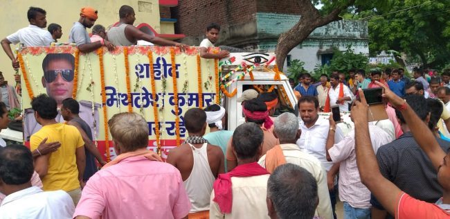 मिथलेश शाह भोजपुर जिले के पिरौटा पंचायत के नागोपुर गाँव के निवासी थे. इनके पिता दशरथ शाह रेलवे में सब इंस्पेक्टर थे जो रिटायर्ड हो चुके हैं. मिथलेश की शादी लगभग 3 साल पहले हुई थी. अपराधियो से मुठभेड़ में शहीद मिथलेश का जब शव गाँव पहुचा तो पूरे गाँव के आसपास के वातावरण में गम का माहौल छा गया. पिरौटा गाँव के सर्वोदय + 2 विद्यालय पिरौटा के सभी टीचर्स व सभी बच्चे शहीद को श्रद्धांजलि देने के लिए सड़क पर ही घण्टों खड़े हो इंतजार करते रहे. इस विद्यालय से जुड़े सभी लोग आखिरी झलक पाने और शोक व्यक्त शहीद के मातम में आँखे नम किये उनके बहादुरी पर फक्र करते हुए खड़े थे. शहीद मिथलेश ने इसी विद्यालय से अपनी पढ़ाई की थी इसलिए विद्यालय के शिक्षक से लेकर विद्यार्थियों तक मे एक विशेष लगाव था अपने विद्यालय से निकले शुरवीर को देखने की. श्रद्धांजलि देने वाले शिक्षकों में मोहम्मद अली ,विवेकानंद पाण्डे, निधित पाण्डे, कमलेश कुमार , विकाश सिंह ,प्रमोद कुमार, अशोक पाण्डे, बसंत सिंह, इसरत जहाँ, राजदुलारी सिन्हा , कनत कुमारी संजना सिंह ,नंदिता कुमारी के साथ सभी छात्र-छात्राएं उपस्थित थी. शहीद के गाँव पहुँचते ही परिवार की कौन कहे पूरा गाँव ही गमगीन था. सभी के आंखों में आंसुओ का सैलाब था. तस्वीरों में देखिए किस तरह का माहौल गाँव मे था…..