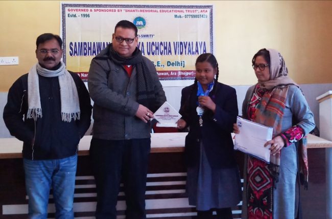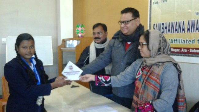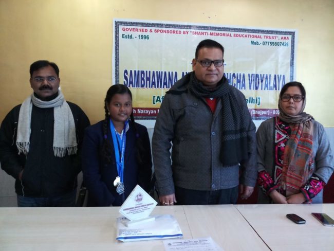 स्थानीय संभावना आवासीय उच्च विद्यालय की कक्षा 6 की छात्रा वैशाली सिंह ने हरियाणा के रोहतक में आयोजित फोर्थ स्टूडेंट्स ओलिंपिक नेशनल गेम 2017-18 के तीरंदाजी प्रतियोगिता में 20 मीटर दूरी तथा 30 मीटर दूरी में दो रजत पदक प्राप्त कर ना सिर्फ भोजपुर को बल्कि पूरे राज्य को गौरवान्वित किया है. कक्षा 6 की छात्रा 12 वर्षीय वैशाली सिंह पिछले 2 वर्षों से तीरंदाजी का अभ्यास कर रही है तथा कई राज्य स्तरीय खेल प्रतियोगिता में मेडल प्राप्त कर चुकी है. वैशाली का लक्ष्य एशियन गेम में भारत के लिए तीरंदाजी में पदक प्राप्त करना है. विद्यालय की प्राचार्य डॉ अर्चना सिंह तथा निदेशक कुमार द्विजेंद्र ने वैशाली को सम्मानित किया. प्रचार्य डॉ अर्चना सिंह ने कहा कि वैशाली ने ना सिर्फ विद्यालय का नाम रोशन किया है बल्कि भोजपुर की समस्त बेटियों के लिए एक मिसाल कायम किया है. विद्यालय के निदेशक कुमार विजेंद्र ने बताया कि बाबू बाजार आरा निवासी विक्रम सिंह की पुत्री ने तीरंदाजी में पदक प्राप्त कर जिस लगन और जुनून का परिचय दिया है वह हमारी वर्तमान युवा पीढ़ी के लिए एक मिसाल है. उन्होंने कहा कि वैशाली को उसके अगले लक्ष्य को प्राप्त करने में विद्यालय प्रबंधन हर संभव सहायता प्रदान करेगा.