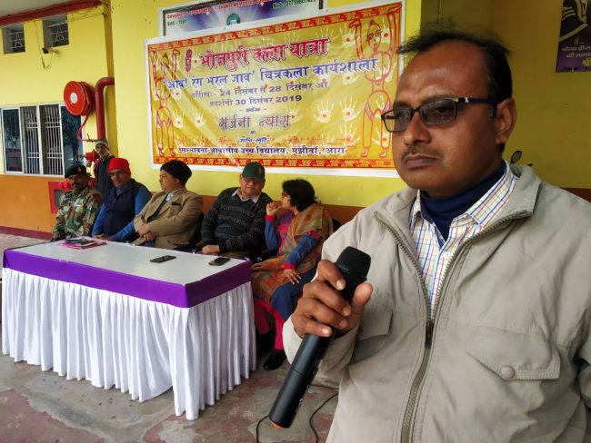 विषय प्रवेश करते हुए संस्कृतिकर्मी सुनील पांडेय ने प्रतिभागियों को भोजपुरी कला से परिचय करवाते हुए कहा कि भोजपुरी चित्रकला दरअसल लेखन शैली है और प्रकृति के रंगों से इसका गहरा सम्बन्ध है.