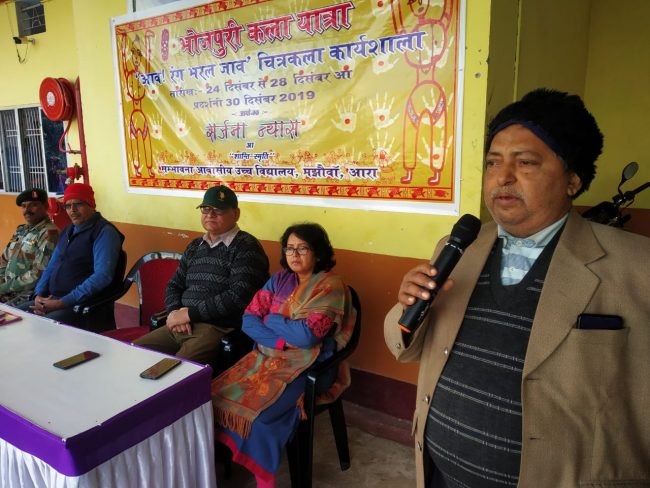 आरा,25 दिसम्बर. भोजपुरी कला यात्रा का शुभारंभ मंगलवार को हुआ. 24- 28 दिसम्बर तक चलने वाले इस कला यात्रा का आयोजन सर्जना न्यास एवं संभावना विद्यालय के संयुक्त तत्त्वाधान में हुआ है. संभावना आवासीय उच्च विद्यालय के प्रांगण में चलने वाले इस पांच दिवसीय कला यात्रा का विधिवत उदघाटन विद्यालय के प्रबंध निदेशक कुमार द्विजेन्द्र, प्राचार्या डॉ अर्चना सिंह, साहित्यकार जनार्दन मिश्र, भोजपुरी रंगकर्मी कृष्णेन्दु यादव, चित्रकार राकेश कुमार दिवाकर, प्रशिक्षक-चित्रकार संजीव सिन्हा और संस्कृतिकर्मी सुनील पांडेय द्वारा संयुक्त रूप से किया.