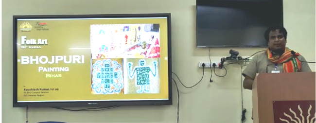 मुंबई में पिछले 21 मार्च 2022 से ट्रेनिंग के लिए देश भर से चुनकर इक्कठे किए गए.केंद्रीय विद्यालय संगठन के 30 कला शिक्षकों का 21 दिवसीय कला प्रशिक्षण चल रहा है, जो 10 अप्रैल तक चलेगा. इस प्रशिक्षण शिविर में बिहार के भोजपुर जिले के रहने वाले कौशलेश कुमार जो कि केंद्रीय विद्यालय, बीएचयू के कला शिक्षक हैं.इसका कारण बतौर संसाधन चयनित किए गए हैं. कौशलेश ने महाराष्ट्र में आयोजित इस कला प्रशिक्षण में भोजपुरी चित्रकला की बारीकियों को शिविर में लोगों को बताया और उसमें प्रयोग होने वाले रंगो और रेखाओं और शैली पर विस्तार से प्रकाश डाला. कला शिविर में भोजपुरी चित्रकला का प्रचार निश्चय ही एक सुखद संकेत है. पूरे भारत भर के अलग अलग प्रदेशों से आए कला के होनहार प्रशिक्षक और प्रशिक्षु आपस में कला के कई रंगों को आपस में साझा कर रहे हैं जो आने वाले भविष्य में कला के लिए मिल का पत्थर साबित होगा.