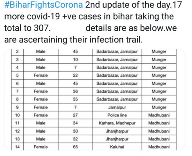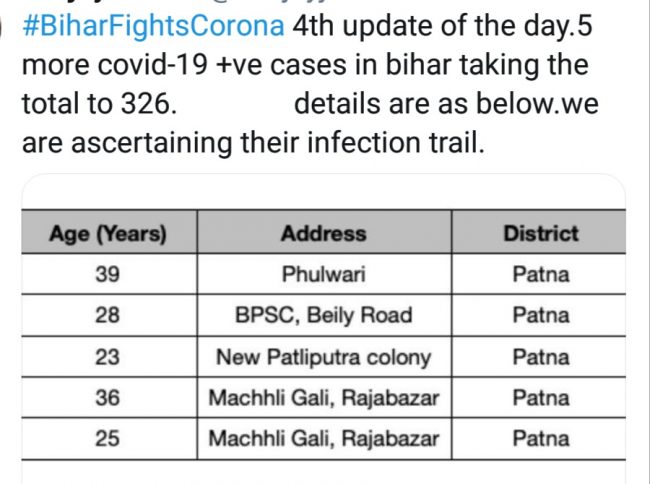 स्वास्थ्य विभाग ने कोरोना पॉजिटिव मरीजों की चौथी सूची जारी की है .चौथी सूची में पटना के 5 पॉजीटिव मरीज मिले हैं. इनमें से चार पुरुष और एक महिला हैं . इन पांच केस में एक फुलवारी शरीफ,एक बीपीएससी बेली रोड पटना, न्यू पाटलिपुत्र कॉलोनी,और मछली गली राजा बाजार के 2 मरीज शामिल हैं. दरभंगा में भी आज पहला मरीज मिला है.