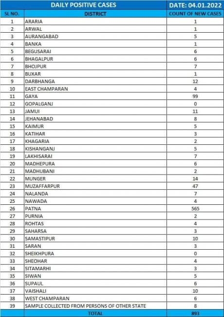 बिहार में कोरोना संक्रमितों की संख्या में 4 जनवरी को बड़ा इजाफा हुआ है. कुल 893 लोग पूरे बिहार में पॉजिटिव पाए गए हैं. पटना में 565 लोग कोरोनावायरस पॉजिटिव मिले हैं. वही गया में कुल 99 लोग कोरोना पॉजिटिव पाए गए हैं.