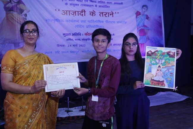 8 से 10 वर्ग में शम्स अली- प्रथम द्वितीय प्राची बर्णवाल और तृतीय शताक्षी मिश्रा ,सांत्वना पुरस्कार उदिता आर्या और अनुष्का कुमारी को दिया गया. वहीँ 5 से 7 वर्ग में ओजम विकास-प्रथम, अनुष्का,द्वितीय विजया लक्ष्मी,तृतीय पुरस्कार मिला वहीँ सांत्वना पुरस्कार-स्पंदन बोस. समृद्धि रश्मि को दिया गया.
