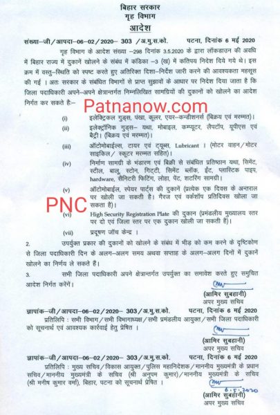 लॉक डाउन के बीच बिहार सरकार ने 6 मई को बड़ा आदेश जारी किया है. गृह विभाग ने सभी डीएम और एसपी को पत्र लिखकर जानकारी दी है कि अब बाजार खुलेंगे. विशेष रूप से हर तरह के निर्माण कार्य, मरम्मत और रिपेयरिंग वर्क आदि दुकानों को खोलने की अनुमति दे दी गई है.