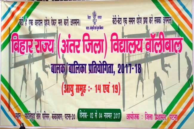 पटना में आज बिहार राज्य अंतर जिला विद्यालय वॉलीबॉल प्रतियोगिता का शुभारंभ हुआ. राजधानी के पाटलिपुत्र खेल परिसर में इस प्रतियोगिता का उद्घाटन पटना के डीएम संजय अग्रवाल ने किया. इसमें विभिन्न जिलों के लगभग 850 खिलाड़ी भाग ले रहे हैं.
