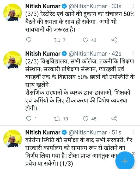 मुख्यमंत्री ने स्पष्ट किया है कि अब बिहार में 11वीं कक्षा के ऊपर तक के स्कूल कॉलेज और शिक्षण संस्थान 50%अटेंडेंस के साथ खुल सकेंगे. उन्होंने फिर भी याद दिलाया है कि लोगों को सावधान रहना जरूरी है. सरकारी दफ्तरों में उन्हीं लोगों को प्रवेश मिलेगा जो टीका लगवा चुके हैं. होटल और रेस्टोरेंट में भी कोरोना प्रोटोकॉल का पालन करते हुए 50% लोग भोजन कर सकेंगे.