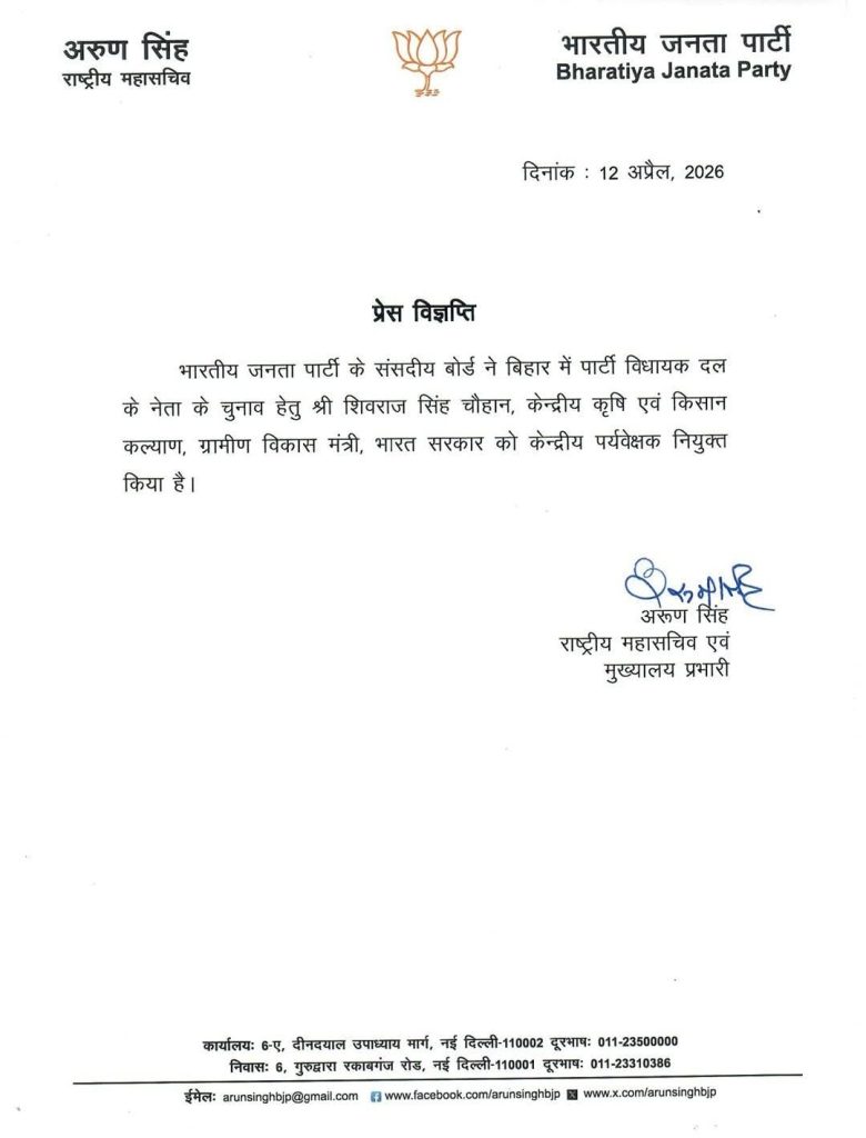 पटना।। जैसे-जैसे खरमास खत्म होने का समय नजदीक आ रहा है बिहार से जुड़े तमाम लोगों की धड़कनें तेज हो रही हैं. ताजा अपडेट के मुताबिक भारतीय जनता पार्टी ने केंद्रीय मंत्री शिवराज सिंह चौहान को बिहार में पार्टी विधायक दल का नेता चुनने की जिम्मेदारी दी है.