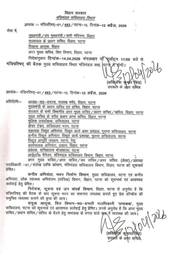 इधर बिहार सरकार की ओर से 14 अप्रैल को सुबह 11:00 बजे कैबिनेट मीटिंग की सूचना जारी की गई है. माना जा रहा है कि 14 अप्रैल को मुख्यमंत्री के तौर पर नीतीश कुमार की यह आखिरी कैबिनेट मीटिंग होगी.
