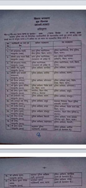 सुशील कुमार को भोजपुर से बोधगया भेजा गया है. उन्हें बीएमपी 3 का समादेष्टा बनाया गया है. हरिकिशोर राय को भोजपुर का एसपी बनाया गया है जबकि धूरत सयाली सबला राम को सारण एसपी की जिम्मेदारी सौंपी गई है. प्रमोद कुमार मंडल को जमुई का एसपी बनाया गया है.