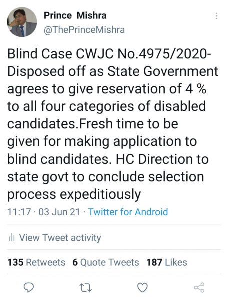 बिहार सरकार दिव्यांग अभ्यर्थियों को 4% आरक्षण देने के लिए राजी है. इसके साथ-साथ पटना हाईकोर्ट ने बिहार सरकार को यह भी निर्देश दिया है कि इस बहाली प्रक्रिया को जल्द से जल्द पूरा किया जाए. आपको बता दें कि पिछले करीब 6 महीने से बिहार में शिक्षक नियोजन प्रक्रिया पर पटना हाईकोर्ट ने रोक लगाई हुई थी. बिहार में करीब 1,21,000 प्राथमिक, मध्य और माध्यमिक शिक्षकों के छठे चरण का नियोजन अब जल्द से जल्द पूरा होने की संभावना बढ़ गई है.