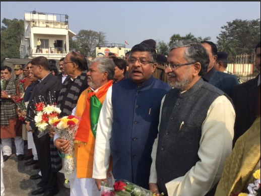 भाजपा के राष्ट्रीय अध्यक्ष अमित शाह मंगलवार को बिहार के एक दिवसीय दौरे पर आज विशेष विमान से पटना पहुंचे जहां बीजेपी के नेताओं और कार्यकर्ताओं ने उनका स्वागत किया.एयर पोर्ट पर केंद्रीय मंत्री राधामोहन सिंह, रवि शंकर प्रसाद, गिरिराज सिंह, बिहार भाजपा के नेता मंगल पांडेय, सुशील मोदी, नंदकिशोर यादव, नित्यानंद राय समेत कई बड़े नेता और कार्यकर्ताओं ने ढोल नगाड़े के साथ अमित शाह का स्वागत किया.