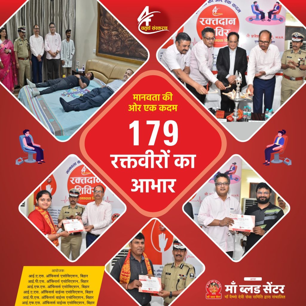 रक्तदान शिविर के चतुर्थ संस्करण में आज विश्व रक्तदाता दिवस के अवसर पर आई.ए. एस. ऑफिसर्स एसोसिएशन, आई.ए. एस. ऑफिसर्स वाईव्स एसोसिएशन, आई.पी.एस. ऑफिसर्स एसोसिएशन, आई. पी.एस. ऑफिसर्स वाईव्स एसोसिएशन, आई.एफ.एस. ऑफिसर्स एसोसिएशन, आई.एफ.एस. ऑफिसर्स वाईव्स एसोसिएशन द्वारा आई.ए.एस. भवन के सभागार में रक्तदान शिविर का आयोजन किया गया.