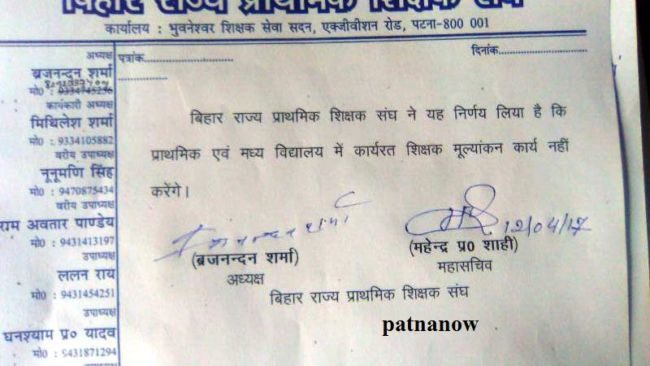 इधर प्राथमिक शिक्षक संघ ने साफ कर दिया है कि वे किसी भी हालत में मैट्रिक की कॉपियों की जांच नहीं करेंगे. प्राथमिक शिक्षक संघ के अध्यक्ष ने कहा कि बिहार विद्यालय परीक्षा समिति नियमों के विरुद्ध काम कर रहा है. मैट्रिक के सिलेबस से अंजान शिक्षकों को कॉपी जांचने को कहा जा रहा है. पढ़ें- https://goo.gl/yWwrxs