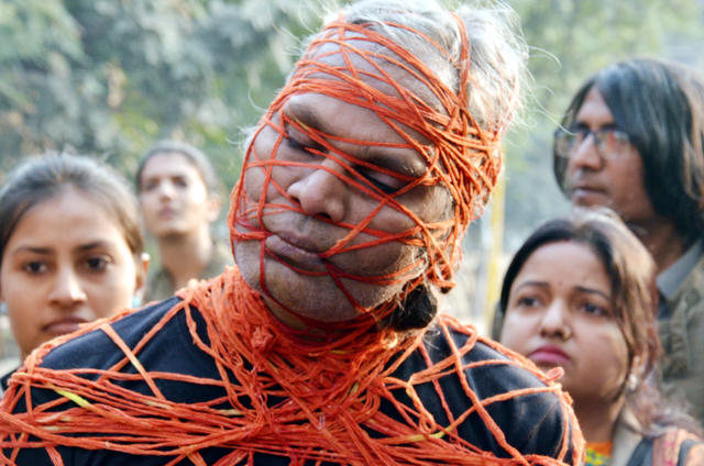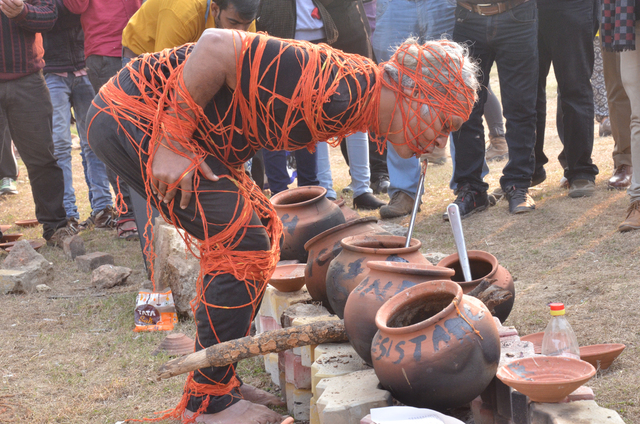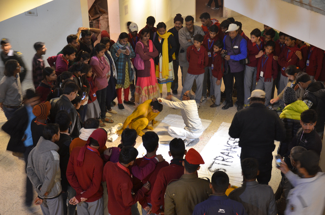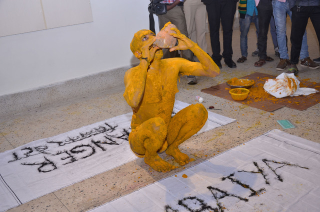 इस कड़ी में पहला प्रदर्शन देश के जाने-माने कलाकार कौशल सोनकरिया का था. कौशल वंचितों के समाज से हैं और वंचित समाज का जिस तरह से शोषण किया गया है, उससे मुक्ति का रास्ता कैसे निकलेगा यह उनकी प्रदर्श कला का विषय था. इसके लिए उन्होंने खुद को पवित्र धागे मौली या रक्षा-सूत्र से बांधा और फिर सुजाता विहार के बाहर एक हजाम से खुद को बंधन मुक्त करवाया. समाज में लोग अक्सर एक साथ कई आवरण ओढे होते हैं चाहे वह सामाजिक संदर्भ में हो या सांस्कृतिक-राजनीतिक संदर्भ में. इन आवरणों में लिपटा इंसान, खासतौर पर निचले तबके के लोग ऊंचे तबके की तमाम वर्जनाओं को ढोने के लिए विवश है, कई बार ऊंचे तबके के लोग अपनी ही वर्जनाओं को ढोते हैं, इसी को मैंने अपने एक्ट में तोड़ने की कोशिश की है.