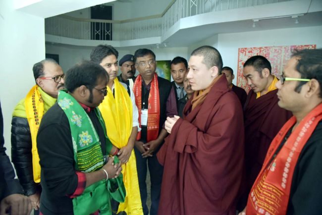 बौद्ध धर्म के शीर्ष धर्मगुरु 17वें करमापा उज्ञेन त्रिनले दोरजी बुधवार को बोधगया बिनाले में पहुंचे और उन्होंने वहां प्रदर्शित कलाकृतियों को जमकर सराहा. करमापा ने बिनाले के आर्टिस्टिक डायरेक्टर विनय कुमार से बातचीत में कहा कि पूरी दुनिया में शांति स्थापित करने में कला का काफी महत्व हो सकता है और इस तरह की प्रदर्शनियों वैश्विक शांति की दिशा में महत्वपूर्ण कदम है. करमापा ने प्रदर्शित कलाकृतियों को काफी बारीकी से देखा.