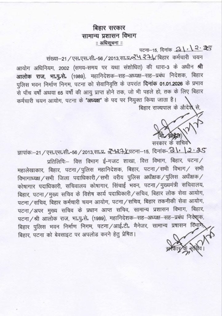 वे पहले इसके अतिरिक्त प्रभार में थे, जिसे अब स्थायी कर दिया गया है. 1989 बैच के आइपीएस अधिकारी आलोक राज वर्तमान में बिहार पुलिस भवन निर्माण निगम के महानिदेशक सह प्रबंध निदेशक थे. आज सेवानिवृत हो गए हैं. अधिसूचना में कहा गया है कि उनकी नियुक्ति 1 जनवरी 2026 से पांच वर्षों अथवा 65 वर्ष की आयु प्राप्त होने तक, जो भी पहले हो के लिए बिहार कर्मचारी चयन आयोग के अध्यक्ष पद पर की जाती है.