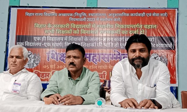 पटना।। बिहार में नई विद्यालय अध्यापक नियमावली के विरोध में राज्य भर के शिक्षकों का जुटान पटना के आईएमए हॉल में हुआ. बिहार शिक्षक संघर्ष मोर्चा के बैनर तले हुए इस महासम्मेलन में कई विधायकों के साथ सैकड़ों की संख्या में शिक्षक मौजूद थे. महासम्मेलन में पहुंचे शिक्षकों ने नई विद्यालय अध्यापक नियमावली के प्रति नाराजगी जताई और सरकार के खिलाफ जमकर नारेबाजी भी की.