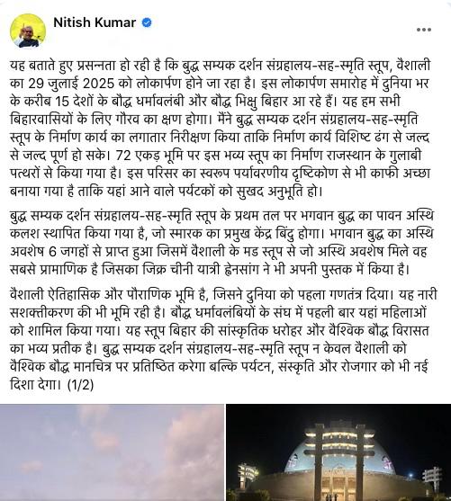 विभाग के सचिव कुमार रवि ने कहा कि बुद्ध सम्यक दर्शन संग्रहालय-सह-स्मृति स्तूप बिहार की सांस्कृतिक धरोहर और वैश्विक बौद्ध विरासत का भव्य प्रतीक है. यह स्मारक वैशाली को विश्व बौद्ध मानचित्र पर स्थापित करेगा और पर्यटन, संस्कृति व स्थानीय रोजगार को नई दिशा देगा.