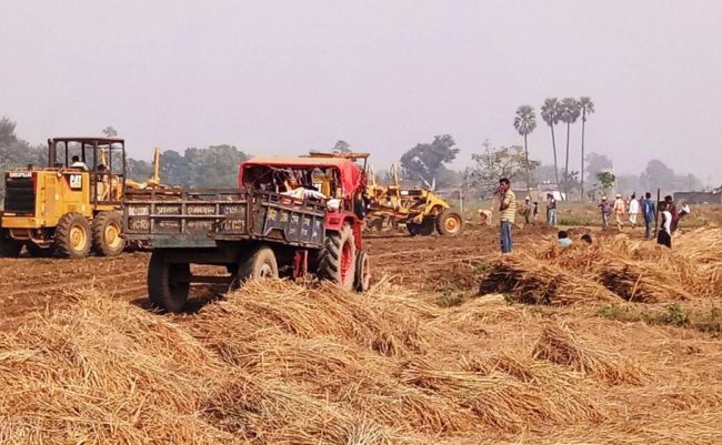 गांव के किसानों द्वारा बोये गए कइयों के धान जबरन हटाने व फसल काटने पर आम ग्रामीणों ने कहा कि बधार में किसानों को भगा सड़क निर्माण हेतु भूमि समतल कर प्रशासन ने सड़क निर्माण शुरू कराई है .