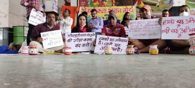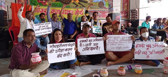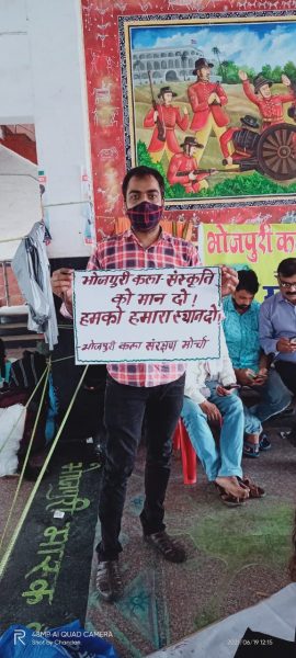 आरा : 19 जून. भोजपुरी पेंटिंग के सम्मान के लिए भोजपुर संरक्षण मोर्चा द्वारा 19वें दिन भी आन्दोलन जारी रहा. कलाकारों ने 19वें दिन पेंटिंग के तरीके को बदल शब्दों में रंग दिया और स्टेशन परिसर आरा में स्थिर प्रदर्शन किया. 18 दिनों से भोजपुरी कला की कलाकृत्तियों को उकेरने वाली कुंचियों ने शब्दों के आकार को गढ़ा और उसे नारे का रूप दिया. कार्डबोर्ड पर चित्रकारों ने इसे पहले लिखा और फिर उसे तख्तियों की तरह हाथों में ले शांतिपूर्ण तरीके से प्रदर्शन कर अपना विरोध जताया.