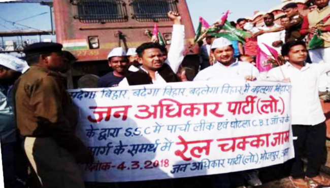 जिसके कारण यात्रियों को परेशानी झेलनी पड़ी. आरा रेलवे स्टेशन पर ट्रेन चक्का जाम कर जन अधिकार पार्टी के सदस्यों ने जमकर हंगामा किया और सरकार विरोधी नारे भी लगाए. पार्टी द्वारा यह चक्का जाम पूरे बिहार में SSC घोटाला में जांच की मांग को लेकर किया जा रहा है.