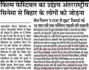 बिहार स्टेट फिल्म डेवलपमेंट एंड फाइनेंस कारपोरेशन लिमिटेड जो कला संस्कृति विभाग के अधीन कार्य कर रहा है .जब ये कारपोरेशन बना तो आनन फानन में तीन दिवसीय बिहार इंटरनेशनल फिल्म फेस्टिवल का आयोजन किया गया.जिसके लिए पास जारी किया गया .कई स्कूलों के बच्चों को विदेशी फिल्म देखने के लिए आमंत्रित किया गया ,स्कूल से बच्चों ने अपने टीचर के साथ शिरकत की .बच्चे फिल्म देख रहे थे. फिल्म थी फ्रेंच की ए टाऊट डी सुइट.फिल्म में अचानक आये सेक्सी दृश्यों ने सब को शर्मसार कर दिया. दृश्य अगर छोटा होता तो उसका उतना बड़ा असर नहीं पड़ता .अब एक लड़की के साथ हो रहे सेक्स के लम्बे दृश्य को बच्चे कितनी देर देखते .लिहाजा बच्चे फिल्म छोड़ कर बाहर आ गये.बच्चे अपने टीचर के साथअपने सहपाठियों के साथ इस फिल्म के दृश्यों को नहीं देख सकते थे.उन्होंने विरोध करना शुरू कर दिया.
