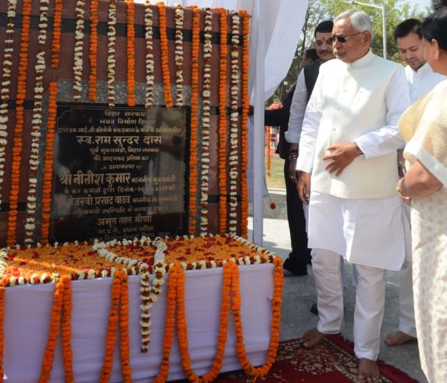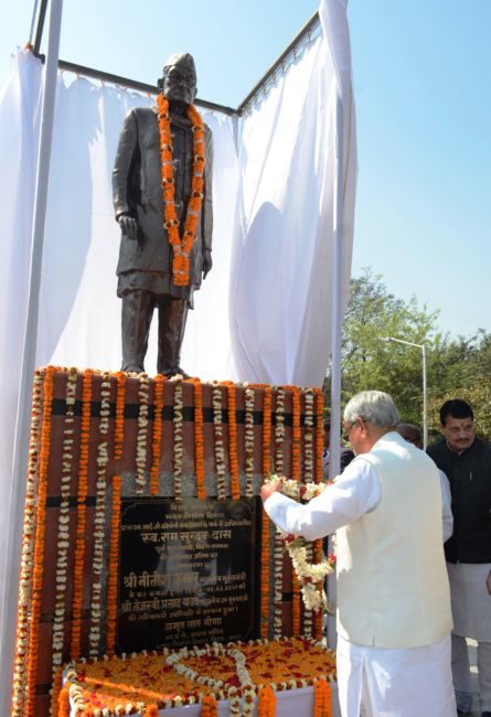 मुख्यमंत्री नीतीश कुमार ने सोमवार को पटना के लोहिया नगर MIG कॉलोनी में बिहार के पूर्व मुख्यमंत्री स्व रामसुंदर दास की आदमकद प्रतिमा का अनावरण किया. इस मौके पर उपमुख्यमंत्री तेजस्वी यादव भी उनके साथ मौजूद थे. दोनों ने पूर्व सीएम को माल्यार्पण कर श्रद्धांजलि दी.