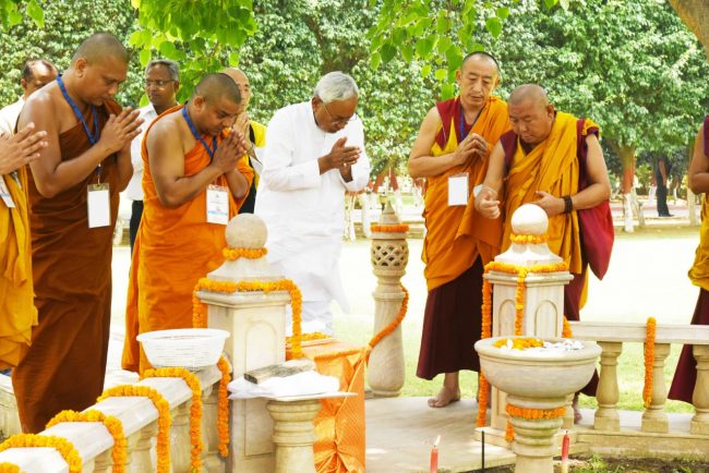 पटना, 16 मई 2022 :- मुख्यमंत्री नीतीश कुमार ने आज भगवान बुद्ध की 2566वीं जयंती के अवसर पर बुद्ध स्मृति पार्क में आयोजित विशेष कार्यक्रम में भगवान बुद्ध की पूजा अर्चना की. मुख्यमंत्री ने बुद्ध स्मृति पार्क में भगवान बुद्ध, बोधिवृक्ष एवं आनंद बोधि वृक्ष की पूजा-अर्चना की. बौद्ध भंते ने मुख्यमंत्री को पूजा अर्चना कराई. मुख्यमंत्री ने बुद्ध स्मृति पार्क स्थित पाटलिपुत्र करुणा स्तूप में भगवान बुद्ध की पवित्र अस्थि के सामने भगवान बुद्ध की पूजा अर्चना की परिक्रमा की और ध्यान किया. उन्होंने बौद्ध भिक्षुओं के साथ बैठकर विश्व शांति के लिए मंगल कामना की तथा राज्य एवं देश की सुख समृद्धि एवं अमन चैन की कामना की. मुख्यमंत्री को बौद्ध भंते द्वारा बुद्ध स्मृति पार्क में प्रतिस्थापित बुद्ध की प्रतिमा तथा बोधगया का बोधिवृक्ष तथा श्रीलंका के अनुराधापूरम से लाये गए वृक्ष की पूजा अर्चना करायी गई.