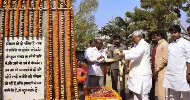 समाजवादी आंदोलन के प्रणेता डॉ. राम मनोहर लोहिया की पुण्यतिथि आज आदर और श्रद्धा के साथ मनाई गई. राजकीय पुण्यतिथि समारोह का अयोजन कंकड़बाग स्थित लोहिया उद्यान, लोहिया नगर पटना में किया गया, जहां मुख्यमंत्री नीतीश कुमार ने राम मनोहर लोहिया की आदमकद प्रतिमा पर माल्यार्पण कर उन्हें शत्-शत् नमन करते हुये श्रद्धांजलि अर्पित की.