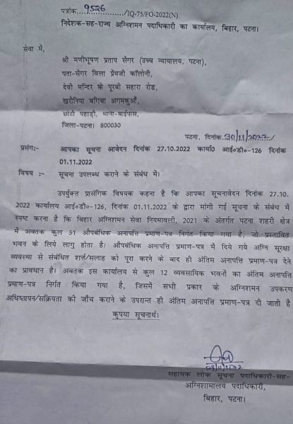 पटना में आए दिन ना सिर्फ सरकारी भवन बल्कि कई अन्य व्यवसायिक भवनों में अगलगी की कई घटनाएं हो चुकी हैं फिर भी बिना फायर एनओसी के ही धड़ाधड़ व्यवसायिक भवन बन रहे हैं और संचालित भी हो रहे हैं. इसे लेकर पटना हाई कोर्ट में सीनियर एडवोकेट मणि भूषण प्रताप सिंह ने एक जनहित याचिका दायर की है. और बिना फायर एनओसी के संचालित होने वाले भवनों की वजह से होने वाले दुर्घटनाओं को लेकर पटना नगर निगम समेत सभी संबंधित विभागों से जवाब मांगा गया है.