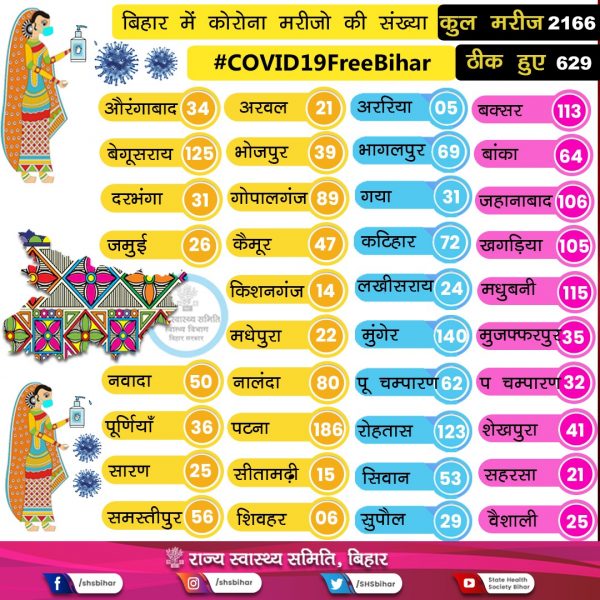 शुक्रवार को बिहार में कोरोना मरीजोंं की संख्या में 179 का और इजाफा हो गया. अब 2166 मरीज बिहार में हैं हालांकि इनमें से 629 लोग स्वस्थ होकर घर जा चुके हैं जबकि 11 लोगों की अब तक मौत हो चुकी है.