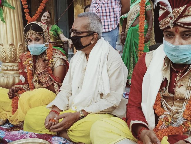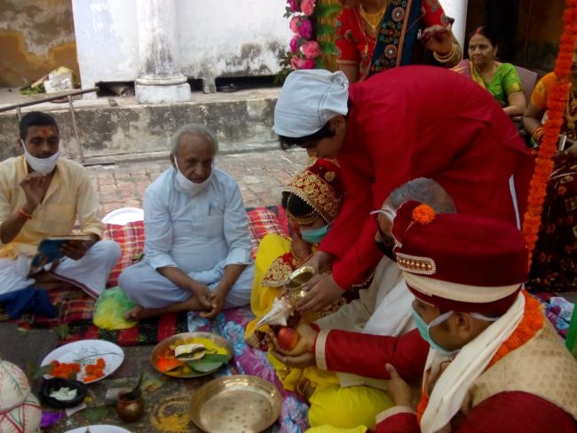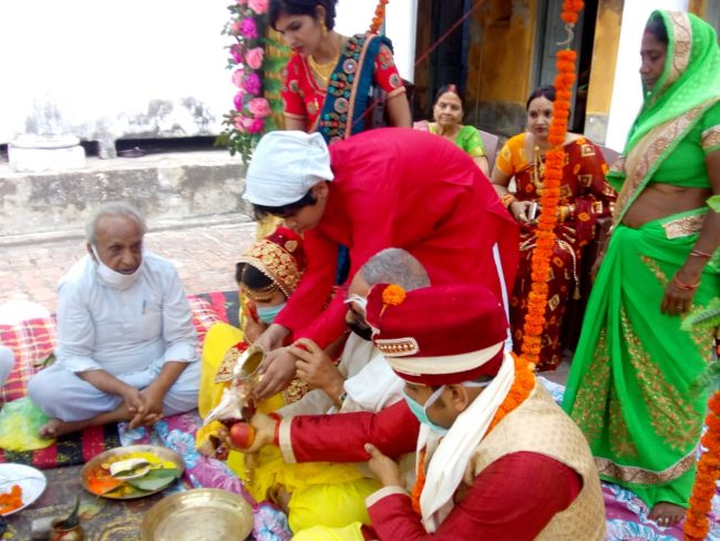 लॉकडाउन का पालन करते हुए दूल्हा शेखर और उसके पिता हिमांशु दूबे तीन लोग के साथ बरात लेकर कचहरी स्टेशन रोड स्थित उदय प्रकाश द्विवेदी और मंजू द्विवेदी के घर पहुंचे. जहां बारातियों का स्वागत करने के बाद लड़की पक्ष के लोगो की तरफ से रिंकू पाण्डेय ने सामाजिक दूरी का पालन करते हुए वधू के पिता उदय प्रकाश द्विवेदी के साथ शादी की रस्में निभाईं. पुरोहित ने वैदिक मंत्रोच्चार और अग्नि को साक्षी मानते हुए वधु निधि और वर शेखर की शादी संपन्न कराई.